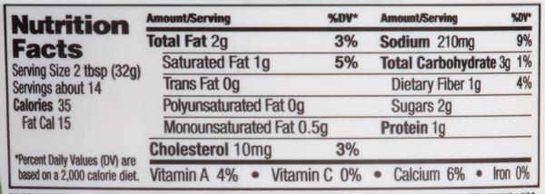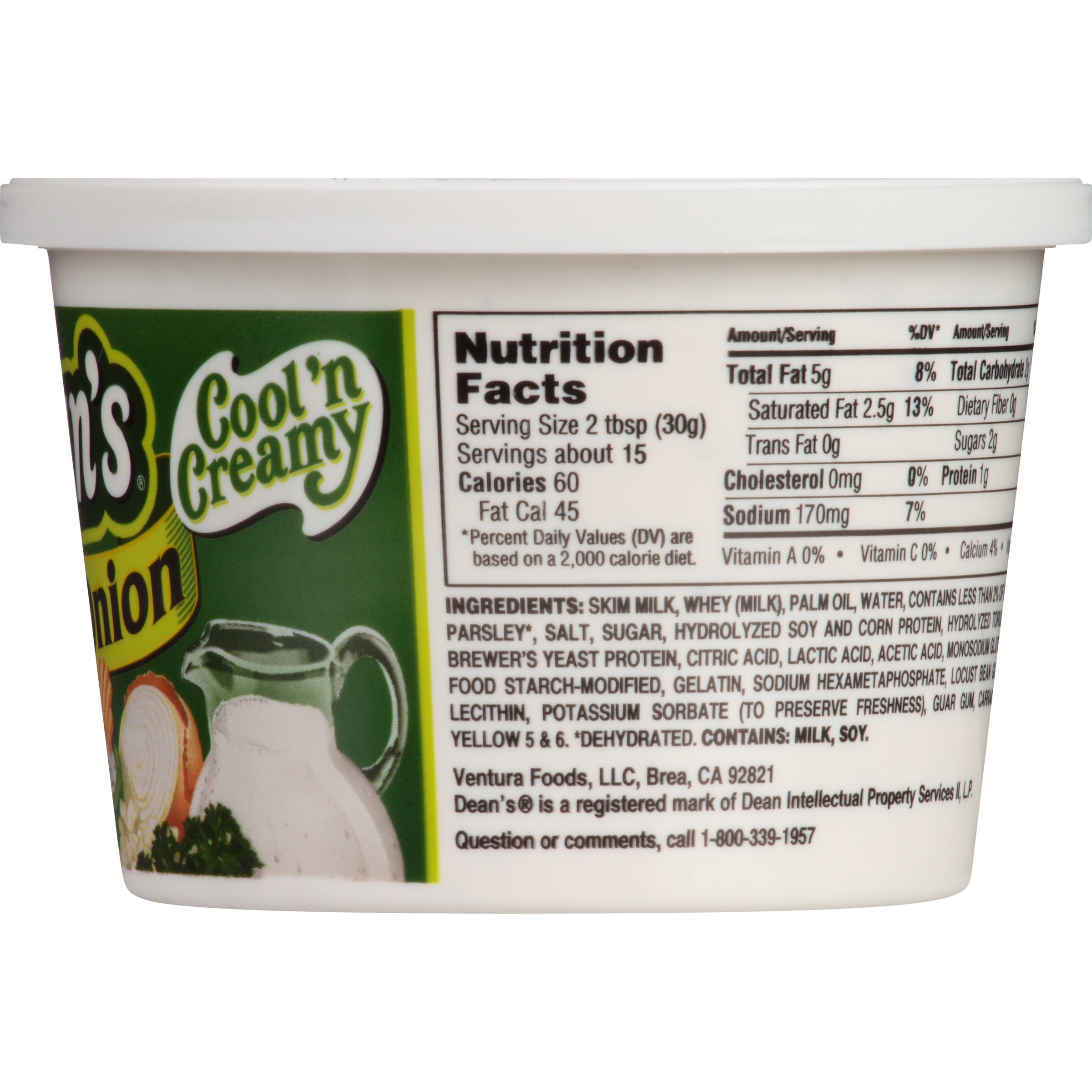 Icon nutritional facts · total fat 5g 8% · saturated fat 2.5g 13% · trans fat 0g · cholesterol 0mg 0% · sodium 170mg 7% · total carbohydrates 2g 1% · dietary fiber 0g . Creamy dip with onions and parsley; Want to use it in a meal plan? Made with wholesome skim milk, it only has 60 calories and0g trans fat per serving. 60 calories per serving (serving size 2 tbsp); Just one dip won't do! Cool and creamy flavor · 0 g trans fat per serving · 0 mg cholesterol per serving · only 2 g of carbs per serving · made with wholesome skim milk · delicious with . Serving size 2 tbsp (31g) calories 50 calories from fat 40 allergens milk *percent daily values are based on a 2,000 calorie diet. Made with wholesome skim milk. 0g trans fat per serving; Personalized health review for dean's french onion dip: This creamy dip with onions and parsley create the classic taste no dipper can resist. Calories, carbs, fat, protein, fiber, cholesterol, and more for smith's, french onion dip (smith dairy products company).