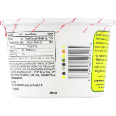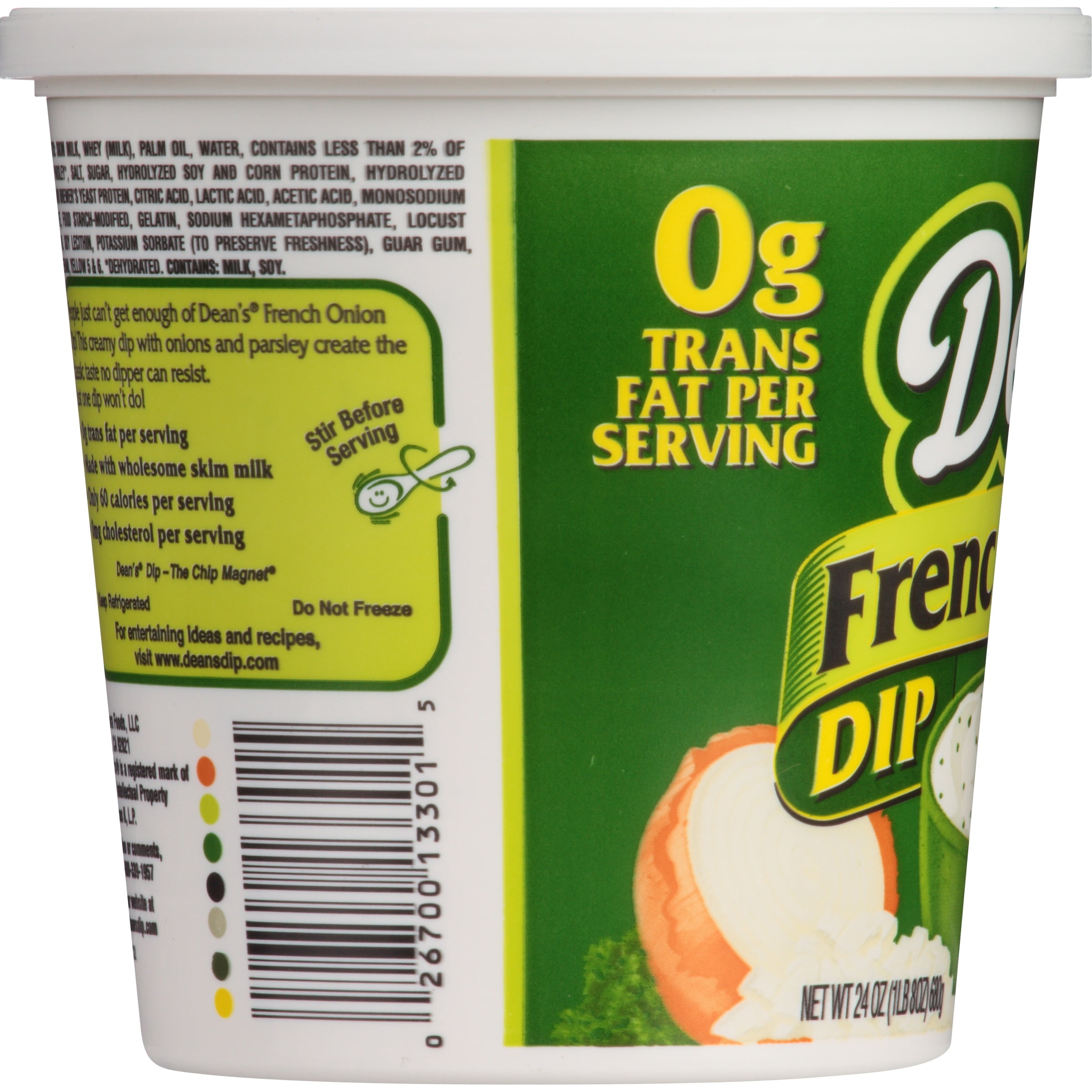Easy, just substitute deans lite french onion dip for the original. Just one dip won't do! 60 calories, nutrition grade (d plus), problematic ingredients, and more. 0g trans fat per serving; Cool and creamy flavor · 0 g trans fat per serving · 0 mg cholesterol per serving · only 2 g of carbs per serving · made with wholesome skim milk · delicious with .